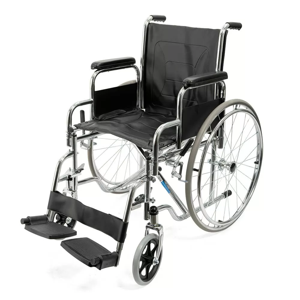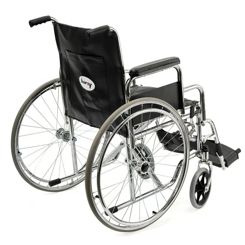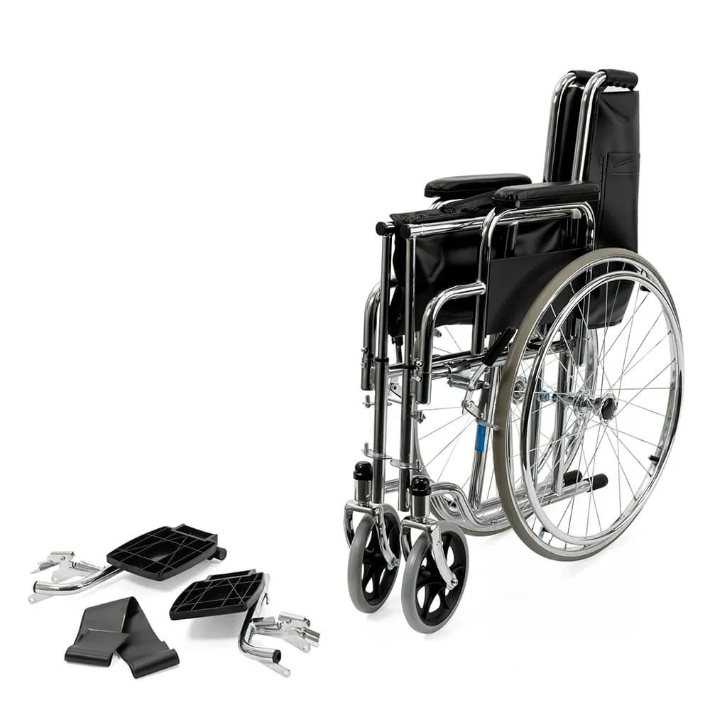 Прочная и надежная стальная рама складывается, благодаря чему кресло занимает мало места при хранении дома или в багажнике легковой машины. Сиденье, как и спинка и обтяжка подлокотников выполнены из полиуретана.