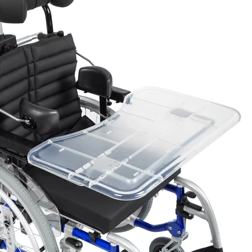 Подголовник и боковые поддержки коляски регулируются по вертикали, горизонтали, углу наклона и обхвату головы, обеспечивая надежную фиксацию и поддержку. Это помогает предотвратить деформации грудной клетки и позвоночника, а также улучшает постуральный баланс. Съемный столик служит дополнительной опорой для верхней части тела, что особенно полезно во время приема пищи.