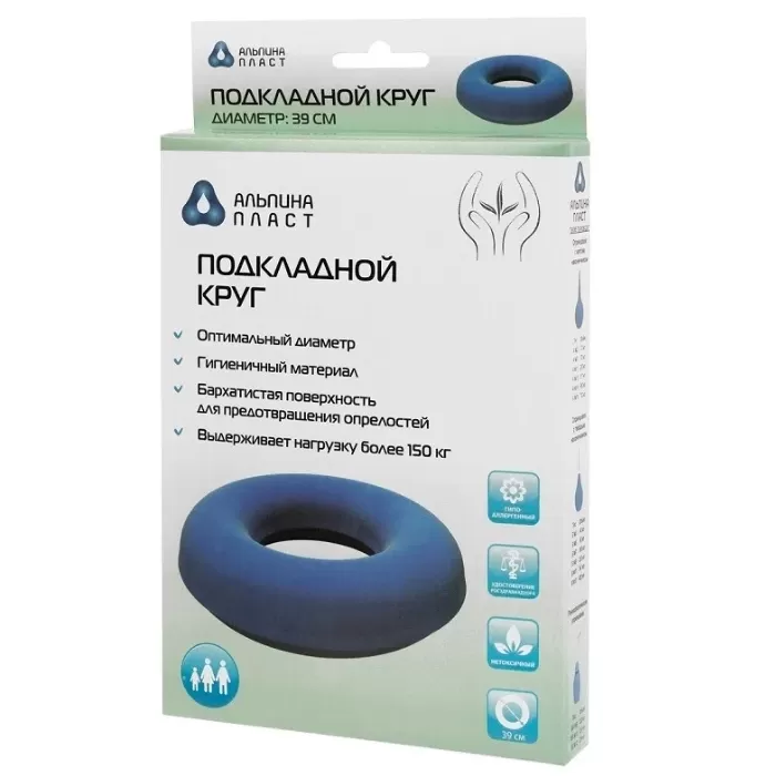 - Использование круга Альпина Пласт не вызывает дискомфорт у пациента - круг подкладывается непосредственно под участок кожи, подвергающийся давлению.