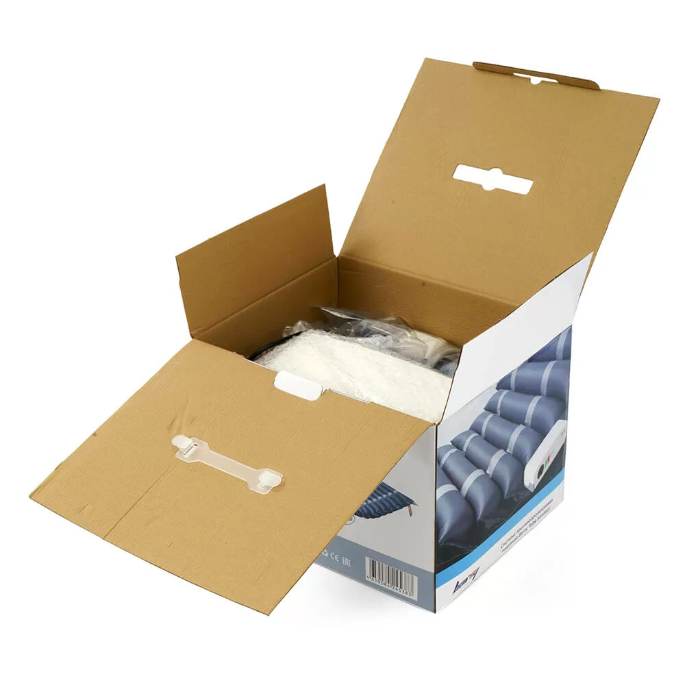 Матрас состоит из трубчатых ячеек, которые поочередно надуваются и сдуваются с помощью компрессора. Такая чередующаяся компрессия оказывает мягкий массажный эффект, снижает давление на ткани и способствует их восстановлению, улучшая циркуляцию крови. Длительность цикла - 12 мин. (6 минут - первый контур, 6 - минут второй контур), при включенной функции статики - 6 минут для полного надувания системы.