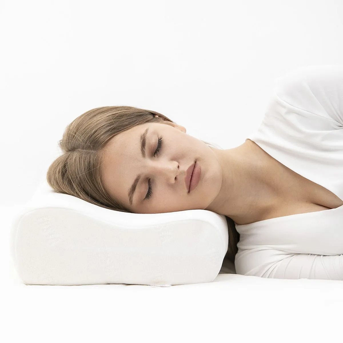 Расположить подушку валиком под шейный отдел. При сне на боку подушку надо располагать высоким валиком под шею, если на спине - низким. Самый физиологичный сон - на бокуИнформация о размерах: