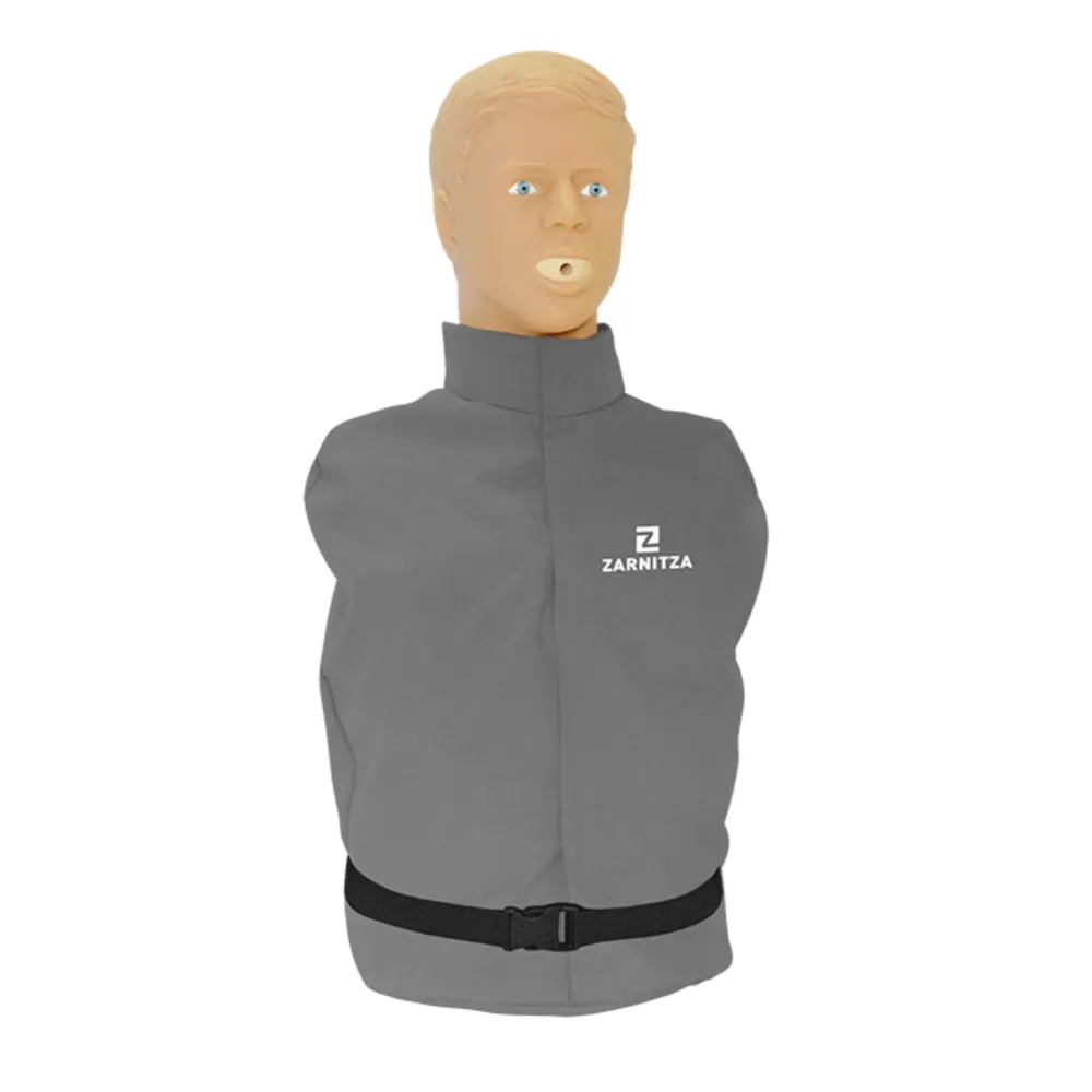Тренажер-манекен представляет собой учебно-методическое оборудование, имитирующее торс взрослого пострадавшего, предназначенное для отработки навыков проведения сердечно-легочной реанимации.Тренажер-манекен имеет подвижное соединение тела с головой, имитирующее шейный отдел позвоночника. В конструкции торса манекена предусмотрены детали и узлы в виде анатомических ориентиров (грудная клетка, мечевидный отросток грудины, соски, ключица) для корректного проведения реанимационных мероприятий.